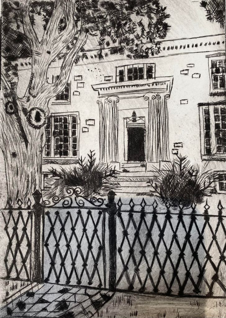 Vintage Estate Winery is a wine company located in Pennsylvania. The vintage look of the label is inspired by the art in the center. This piece is an original intaglio print done on a plexiglass plate that I then recolored digitally to create the different types of wine.
