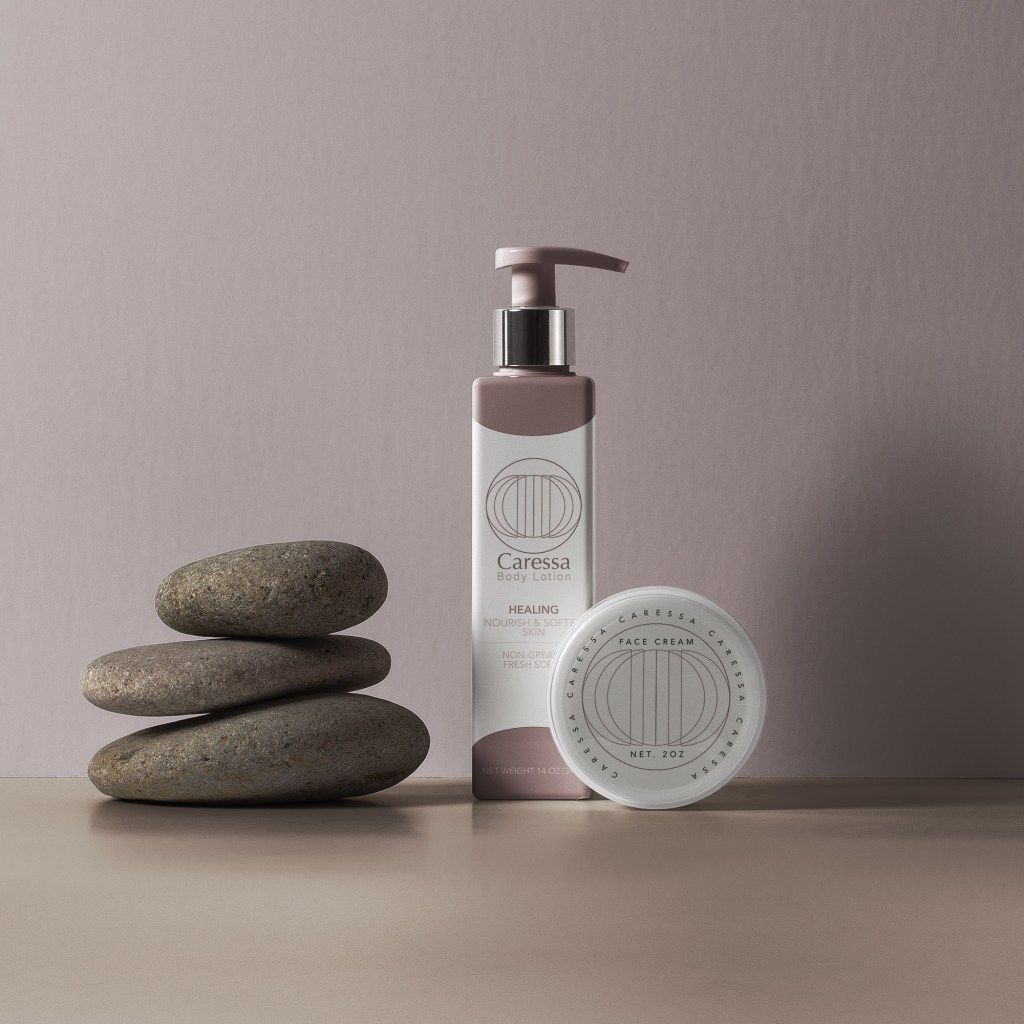 Caressa is a skincare company, and this specific mock-up is showcasing their line of body and face moisturizing lotion.