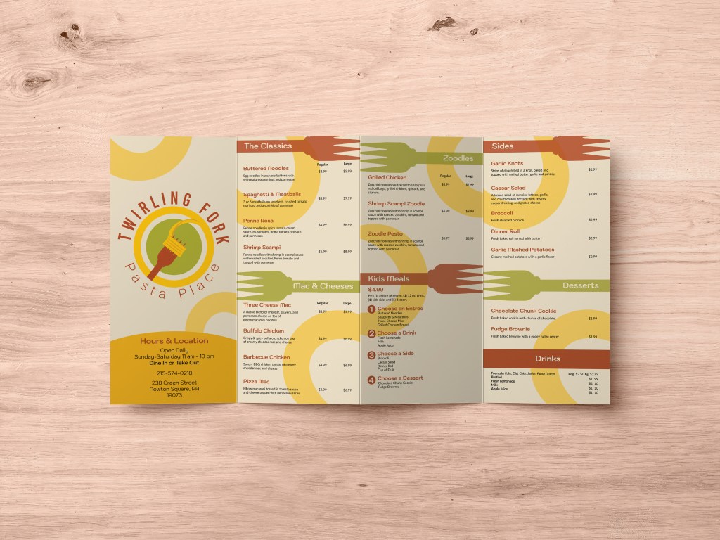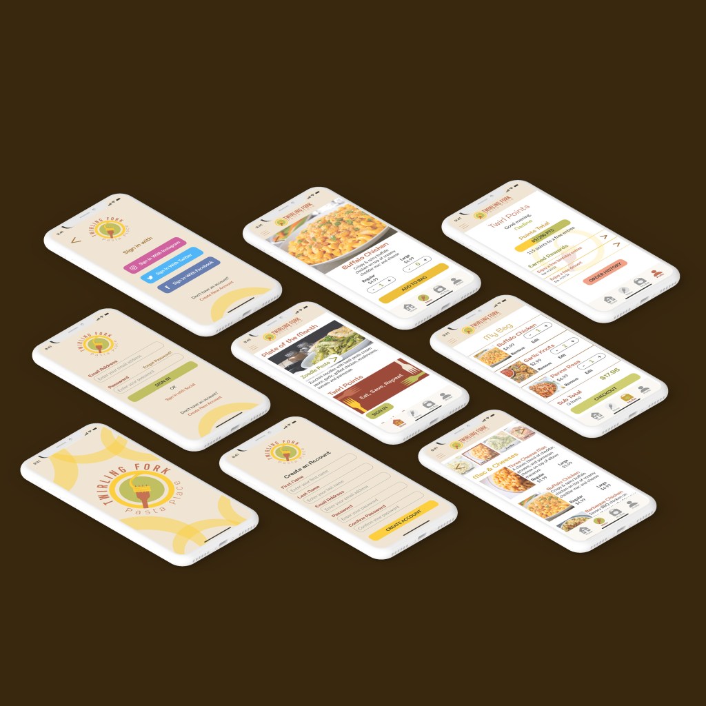 Twirling Fork Pasta Place is the go-to place for all things pasta. This project incorporates various forms of restaurant design such as branding, packaging design, menu design, and mobile app design.